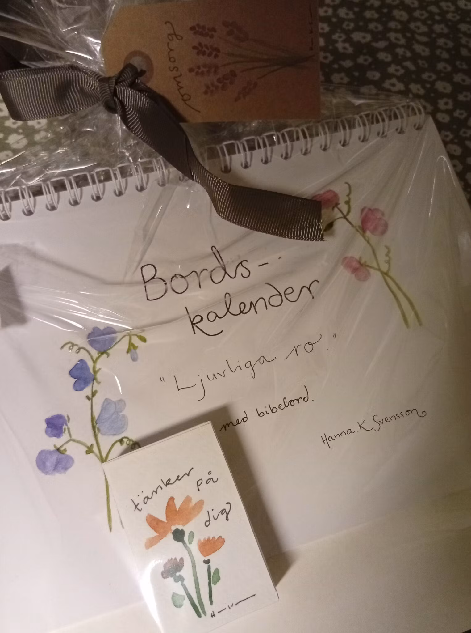 Bordskalendern innehåller bilder av blommor, målade i akvarell med bibelord som innehåller orden LJUVLIGT och RO.