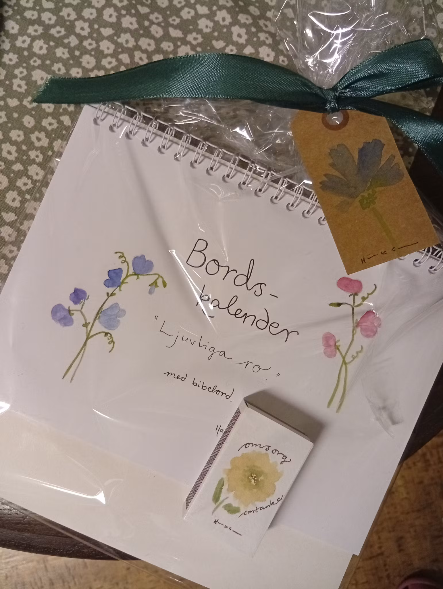 Bordskalendern innehåller bilder av blommor, målade i akvarell med bibelord som innehåller orden LJUVLIGT och RO.
