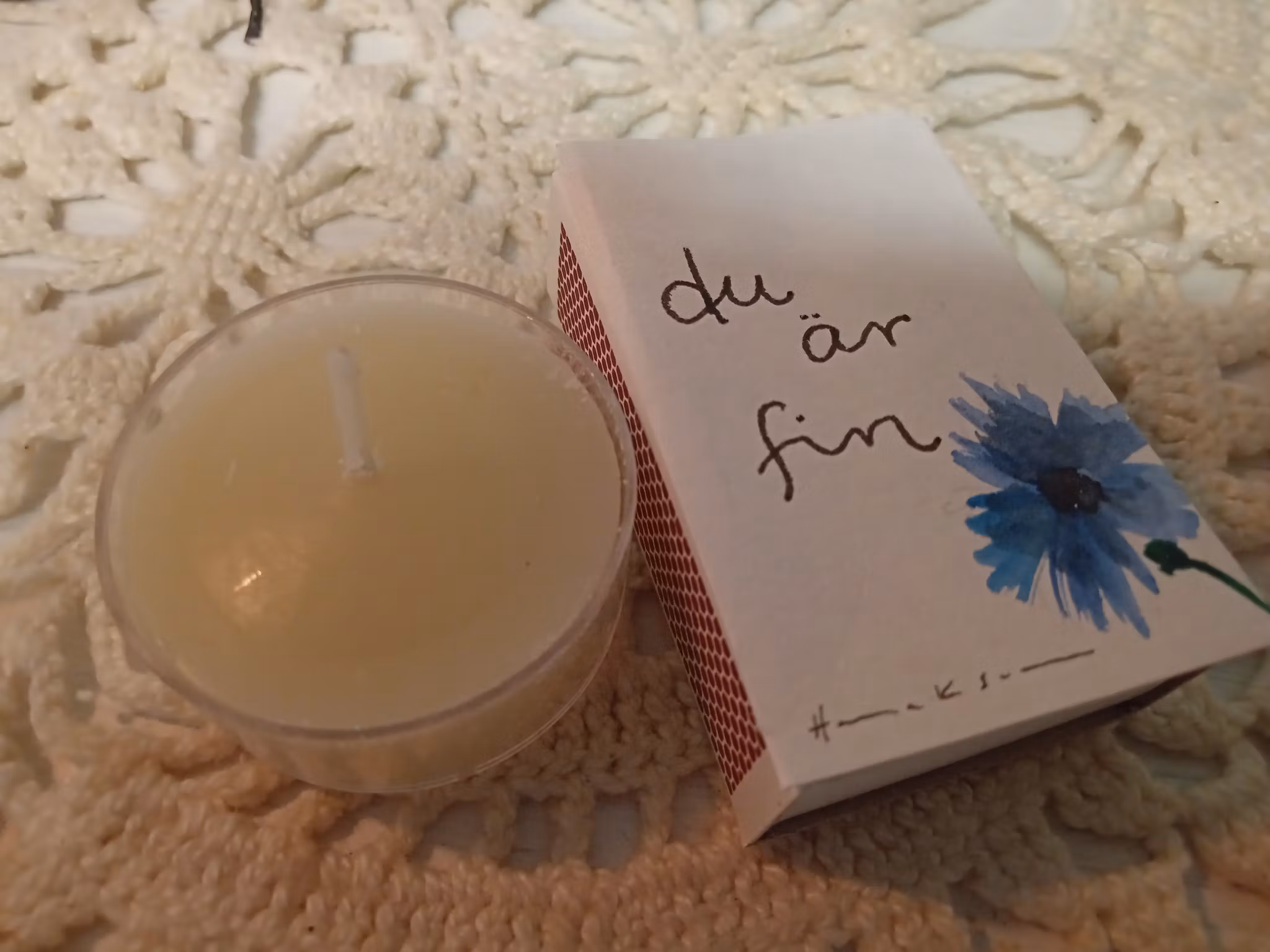 Tändsticksask med doftljus 40 kr Produkten är tyvärr slut i lager. :( Produktbeskrivning Handmålad tändsticksask med doftljus i cellofan
