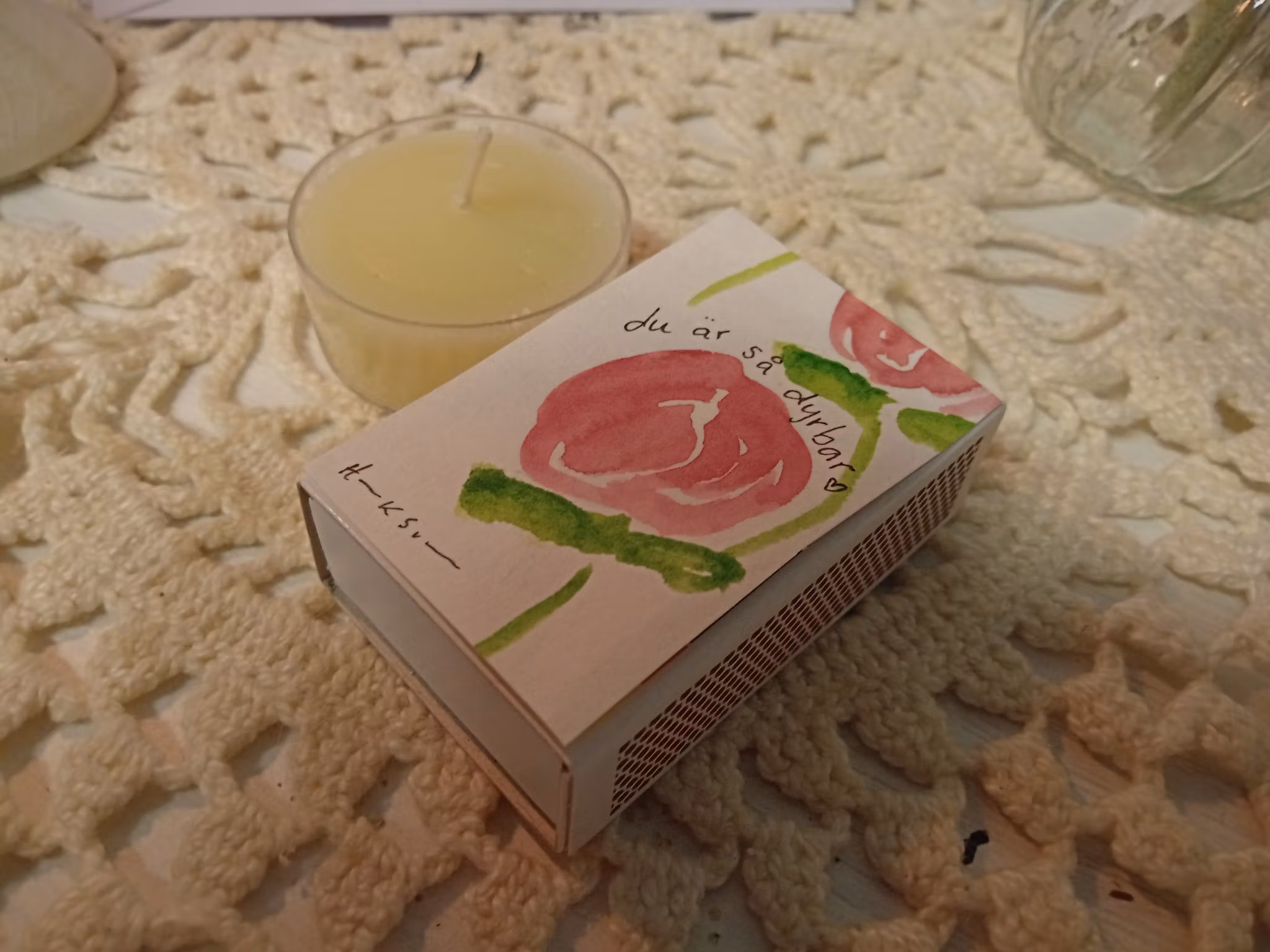 Tändsticksask med doftljus 40 kr Produkten är tyvärr slut i lager. :( Produktbeskrivning Handmålad tändsticksask med doftljus i cellofan.