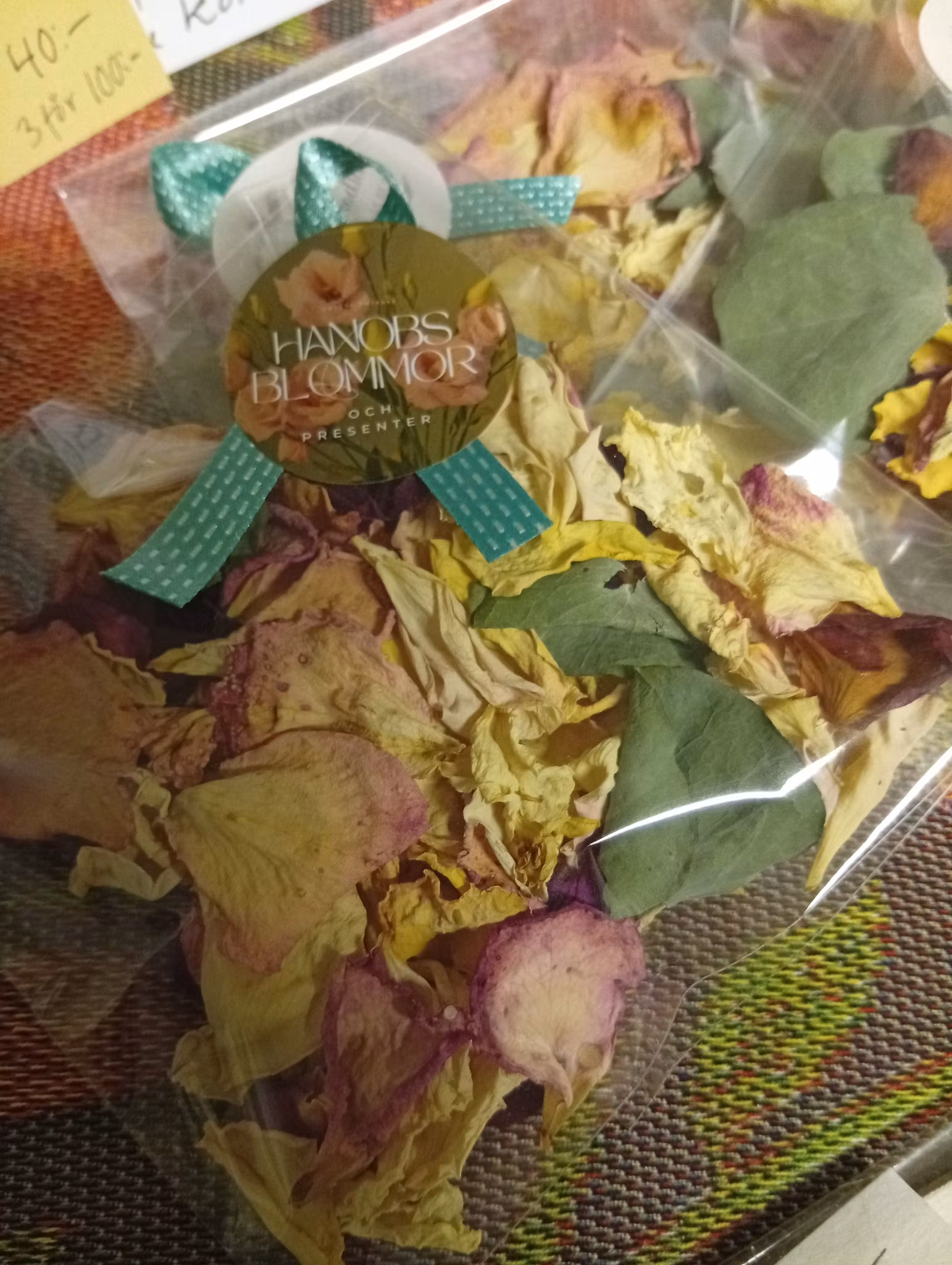 Små påsar med egenodlade torkade rosor och eucalyptus. Passar perfekt att dekorera bord med eller kasta på brudpar. Eller till det du tycker passar!